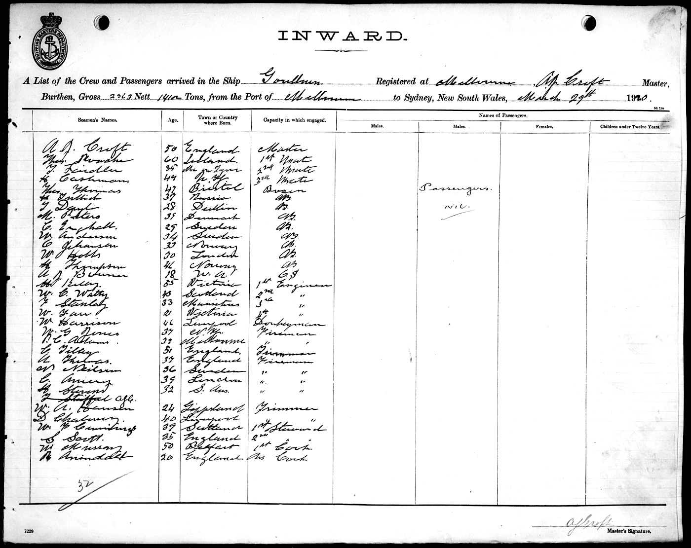 GOULBURNOF MELBOURNE, A. J. CROFT, MASTER, BURTHEN 2363/1412 TONS FROM THE PORT OF MELBOURNE TO SYDNEY, NEW SOUTH WALES, 29TH MARCH 1920 |