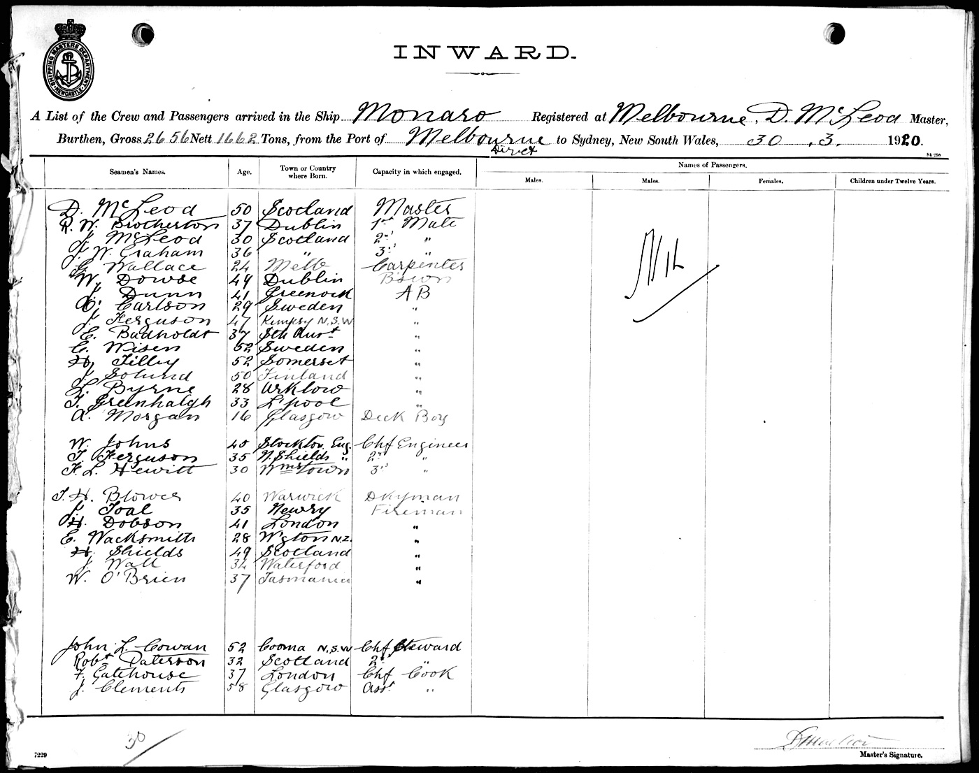 Mariners and ships in Australian Waters | MONAROOF MELBOURNE, D. MCLEOD, MASTER, BURTHEN 2656/1662 TONS FROM THE PORT OF MELBOURNE TO SYDNEY, NEW SOUTH WALES, 30TH MARCH 1920 |