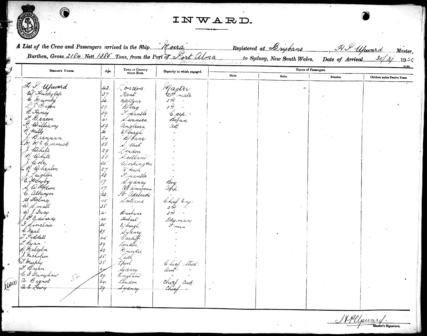 MOIRAOF BRISBANE, H. P. UPWARD, MASTER, BURTHEN 2184/1385 TONS FROM THE PORT OF CAIRNS, TOWNSVILLE, PORT ALMA & BRISBANE TO SYDNEY, NEW SOUTH WALES, 30TH MARCH 1920 |