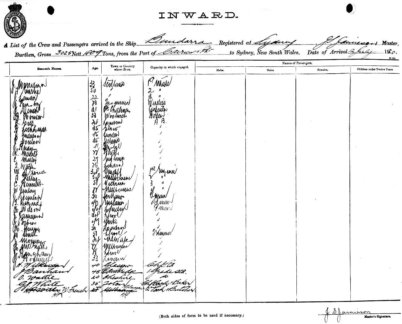 Source: State Records Authority of New South Wales: Shipping Master's Office; Passengers Arriving 1855 - 1922; NRS13278, [X445] reels 2111, 2112. Transcribed by Lester Hamilton. Proofread by Lyn & Maurie. You may view/print a scan of the original list - a monitor set to high resolution is recommended for clarity. Use your back button to return. |