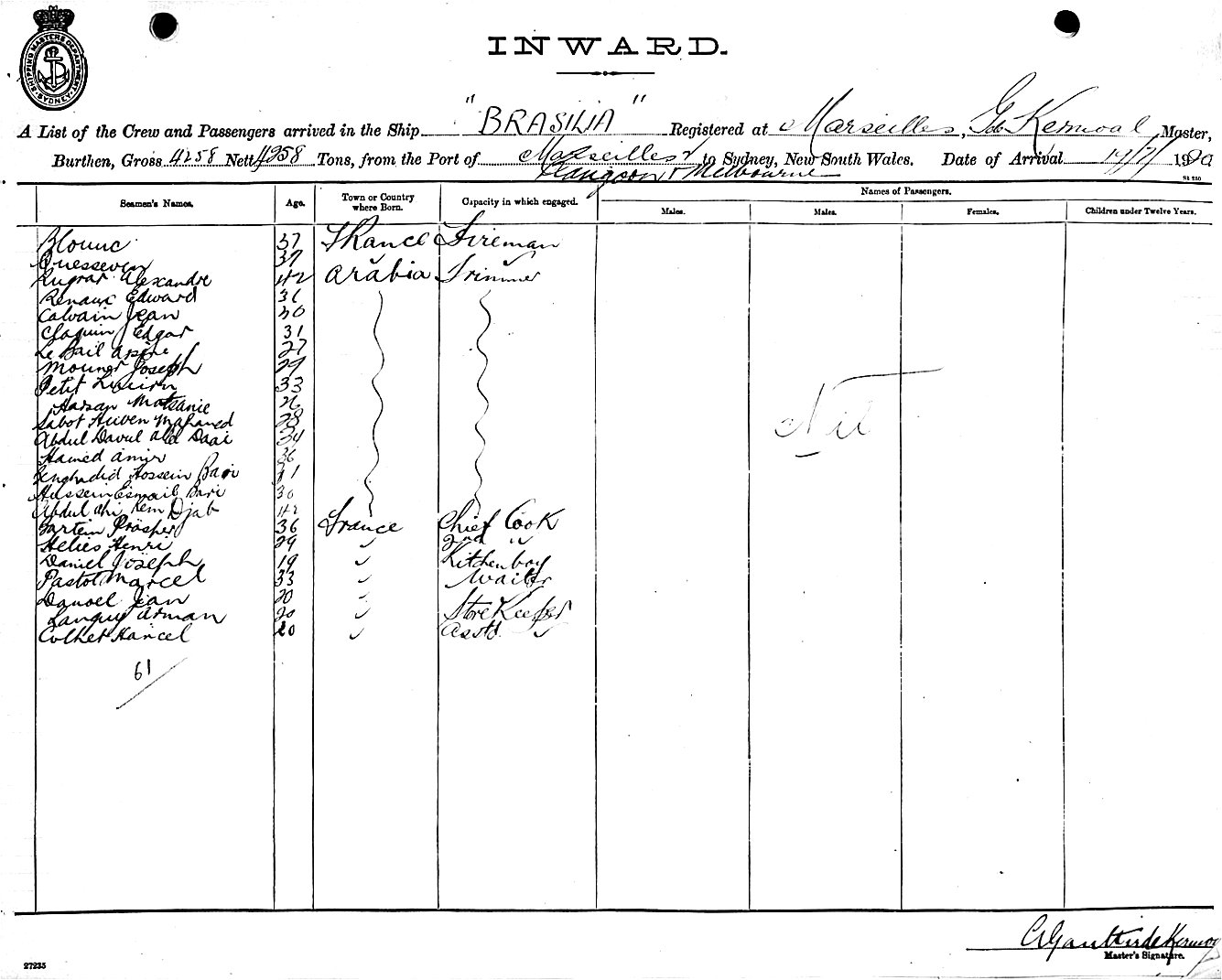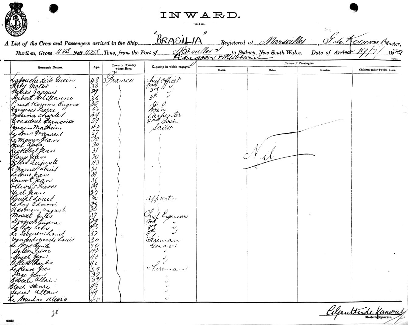 BRASILIAOF MARSEILLE, G. DE KERMOAL, MASTER, BURTHEN 4258 TONS FROM THE PORT OF MARSEILLE, RANGOON & MELBOURNE TO SYDNEY, NEW SOUTH WALES, 19TH JULY 1920 |