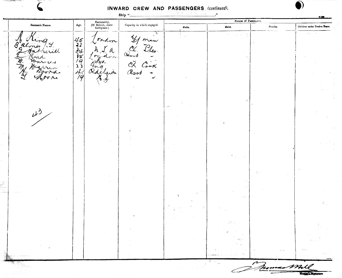 Source: State Records Authority of New South Wales: Shipping Master's Office; Passengers Arriving 1855 - 1922; NRS13278, [X449] reels 2113, 2751. Transcribed by Lester Hamilton. Proofread by Lyn & Maurie. You may view/print a scan of the original list - a monitor set to high resolution is recommended for clarity. Use your back button to return. |