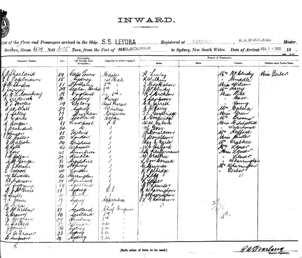 LEVUKAOF SYDNEY, R. A. SHARLAND, MASTER, BURTHEN 6129/3055 TONS FROM THE PORT OF MELBOURNE TO SYDNEY, NEW SOUTH WALES, 11TH JULY 1921 |