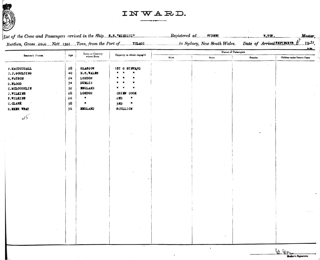 MINDINIOF SYDNEY, W. VOY, MASTER, BURTHEN 2060/1301 TONS FROM THE PORTS OF TULAGI & RABAUL TO SYDNEY, NEW SOUTH WALES, 6TH SEPTEMBER, 1921 |