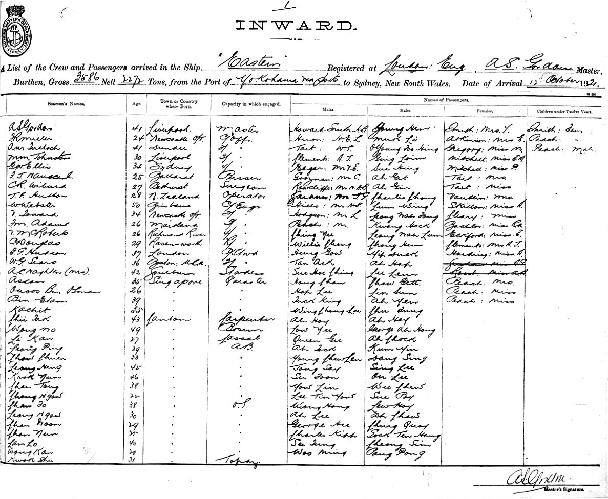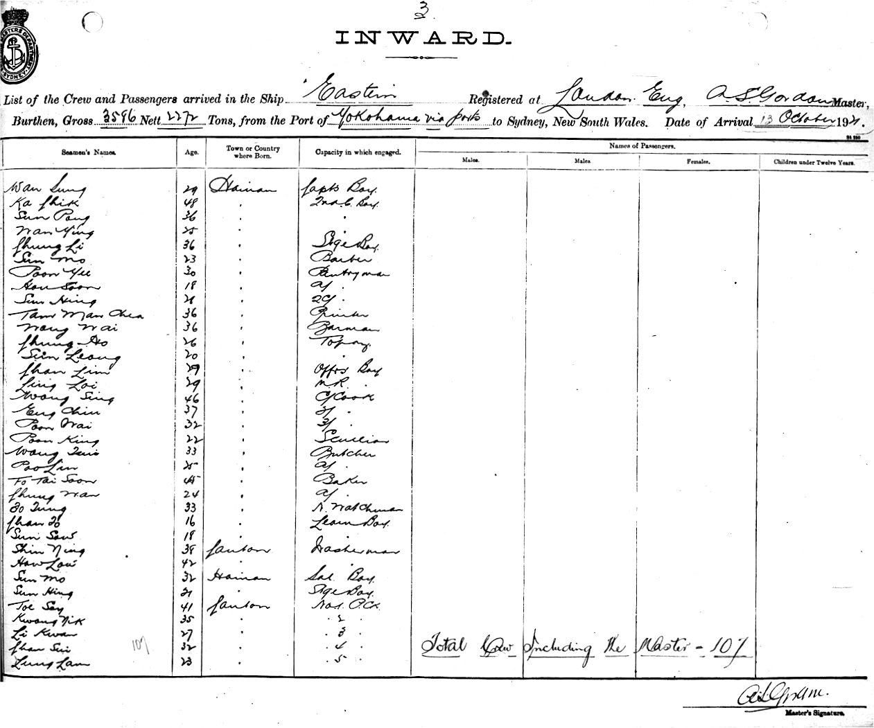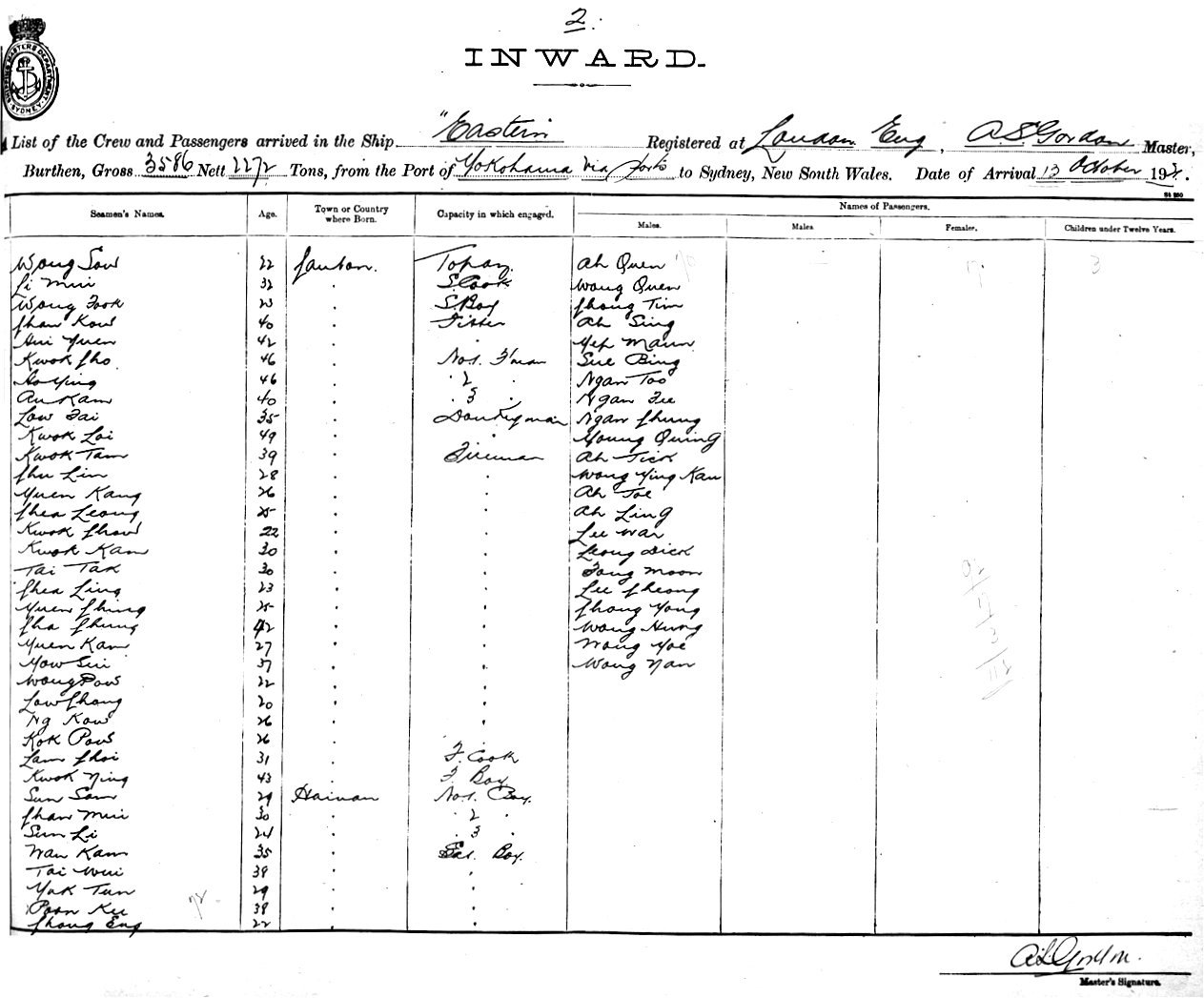 EASTERNOF LONDON, A. S. GORDON, MASTER, BURTHEN 3586/2272 TONS FROM THE PORT OF YOKOHAMA via PORTS TO SYDNEY, NEW SOUTH WALES, 13TH OCTOBER 1921 |
