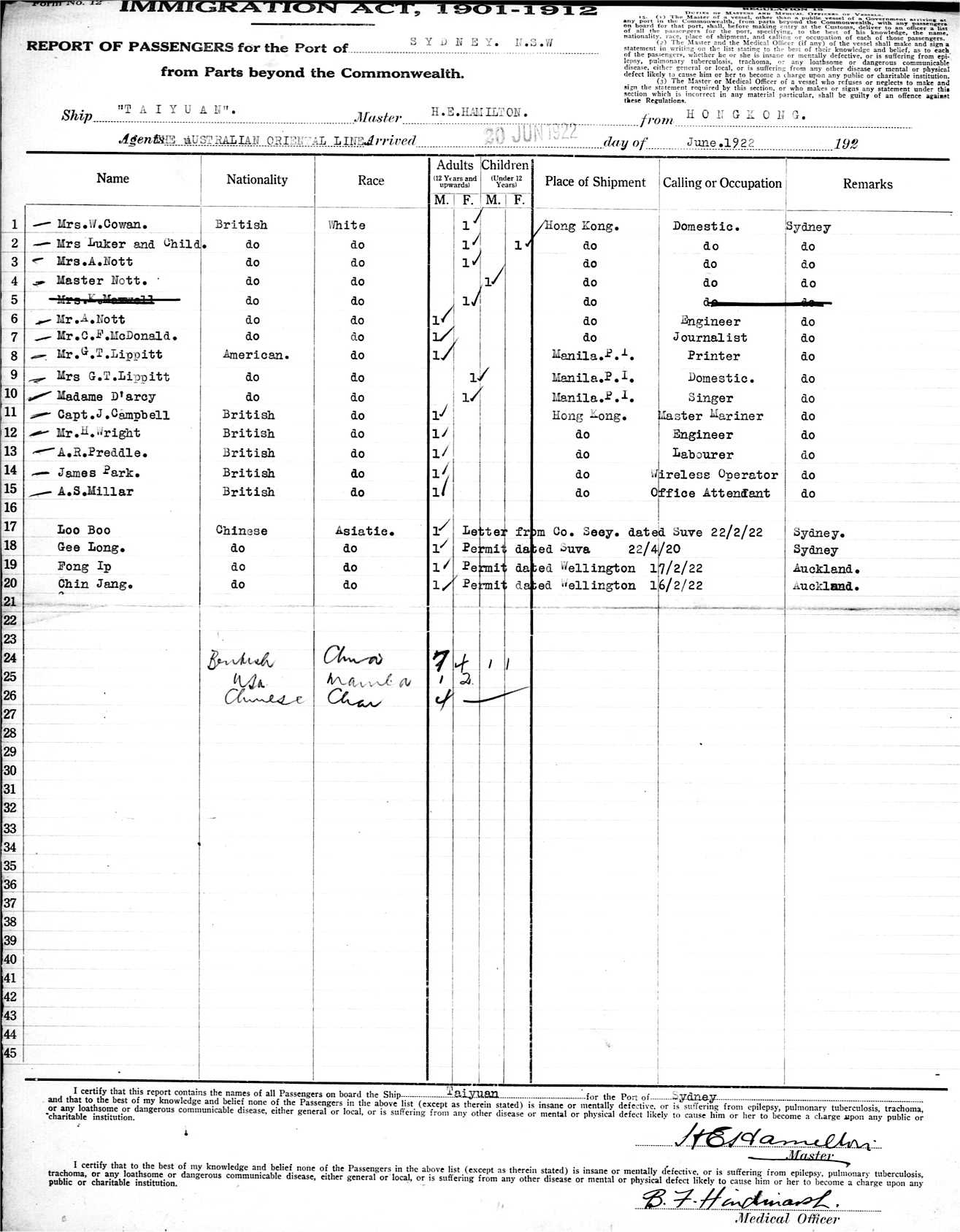 TAIYUANH. E. HAMILTON, MASTER, THE AUSTRALIAN ORIENTAL LINE, AGENT FROM THE PORT OF HONG KONG TO SYDNEY, NEW SOUTH WALES, 20TH JUNE 1922 |